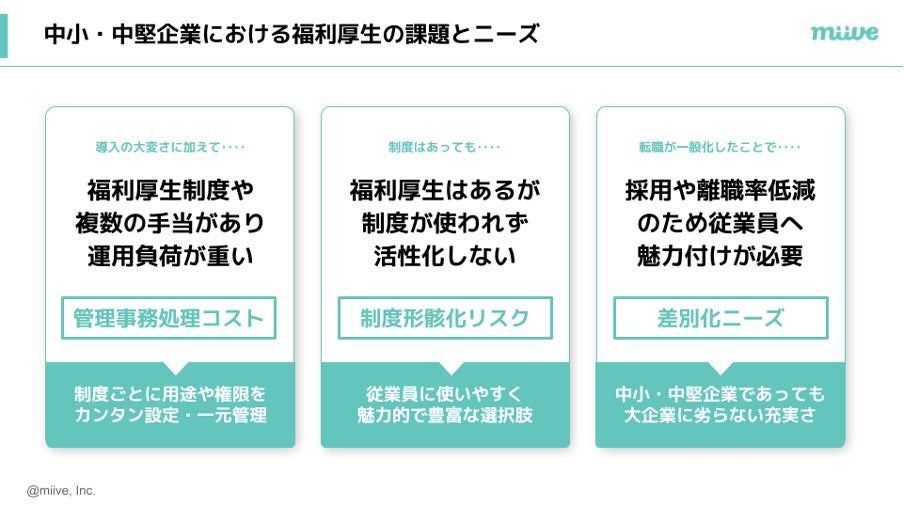 福利厚生のニーズが高まる一方で、これまでの福利厚生サービスは大企業向けの選択肢が多く、導入コストと効果がなかなか見合わないという声が聞かれます。一方で、中小企業にとっては自社で制度運用をするには管理コストや事務処理コストが高く、また大企業が利用するカフェテリアプランは機能面でのフィット感も低いなど、福利厚生制度の整備はハードルが高い現状があります。