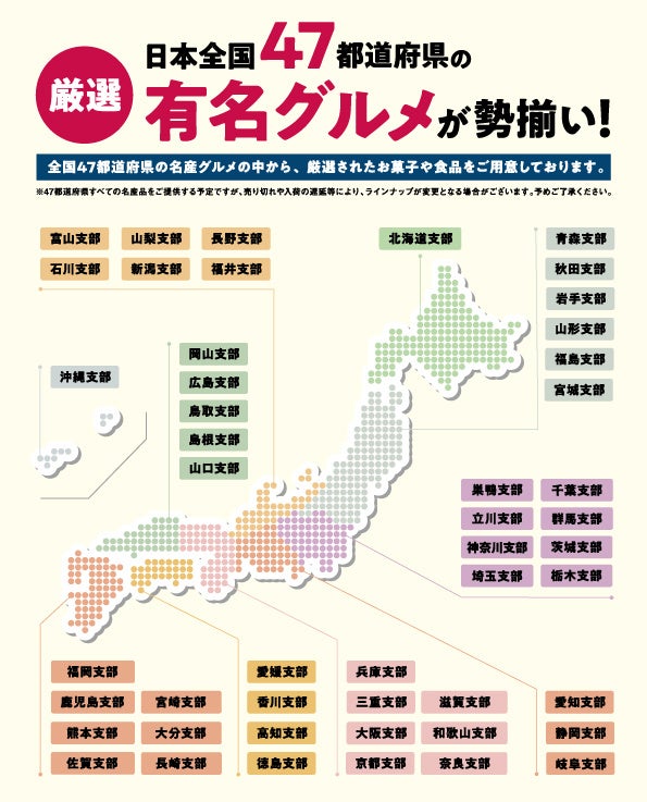 北は北海道から南は沖縄まで、全国47都道府県の名産グルメの中から、厳選されたお菓子や食品をご用意いたしました。全国の支部で配布中のチラシ及びQRコードからアクセスできるWEBサイトにて、会場にて使用可能な特別クーポンも配布いたします。