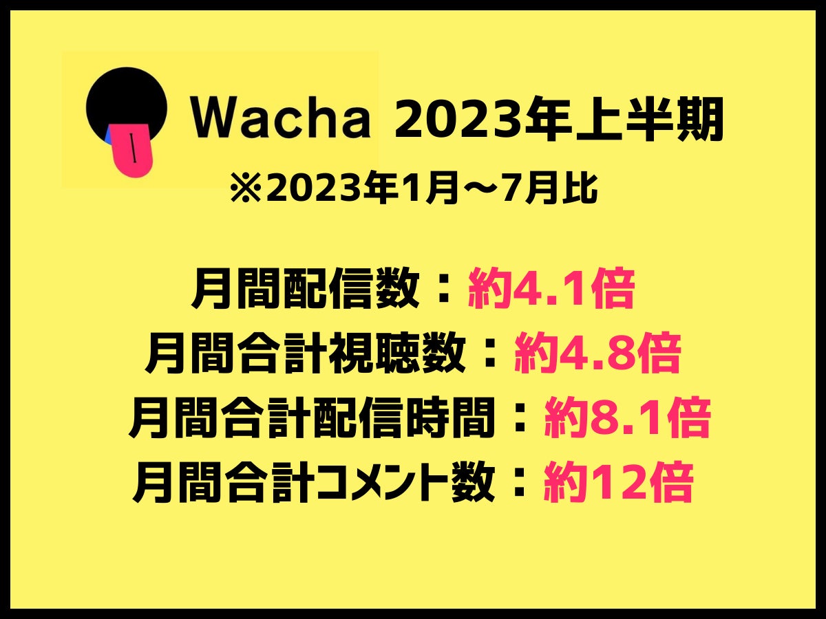 音声ソーシャルアプリWacha(ワチャ)は、2023年上半期(2023年1月~7月)において、月間配信数:約4.1倍の増加、月間合計視聴数:約4.8倍の増加、月間合計配信時間:約8.1倍の増加、月間合計コメント数:約12倍の増加と、コミュニティが大幅に活性化しました。