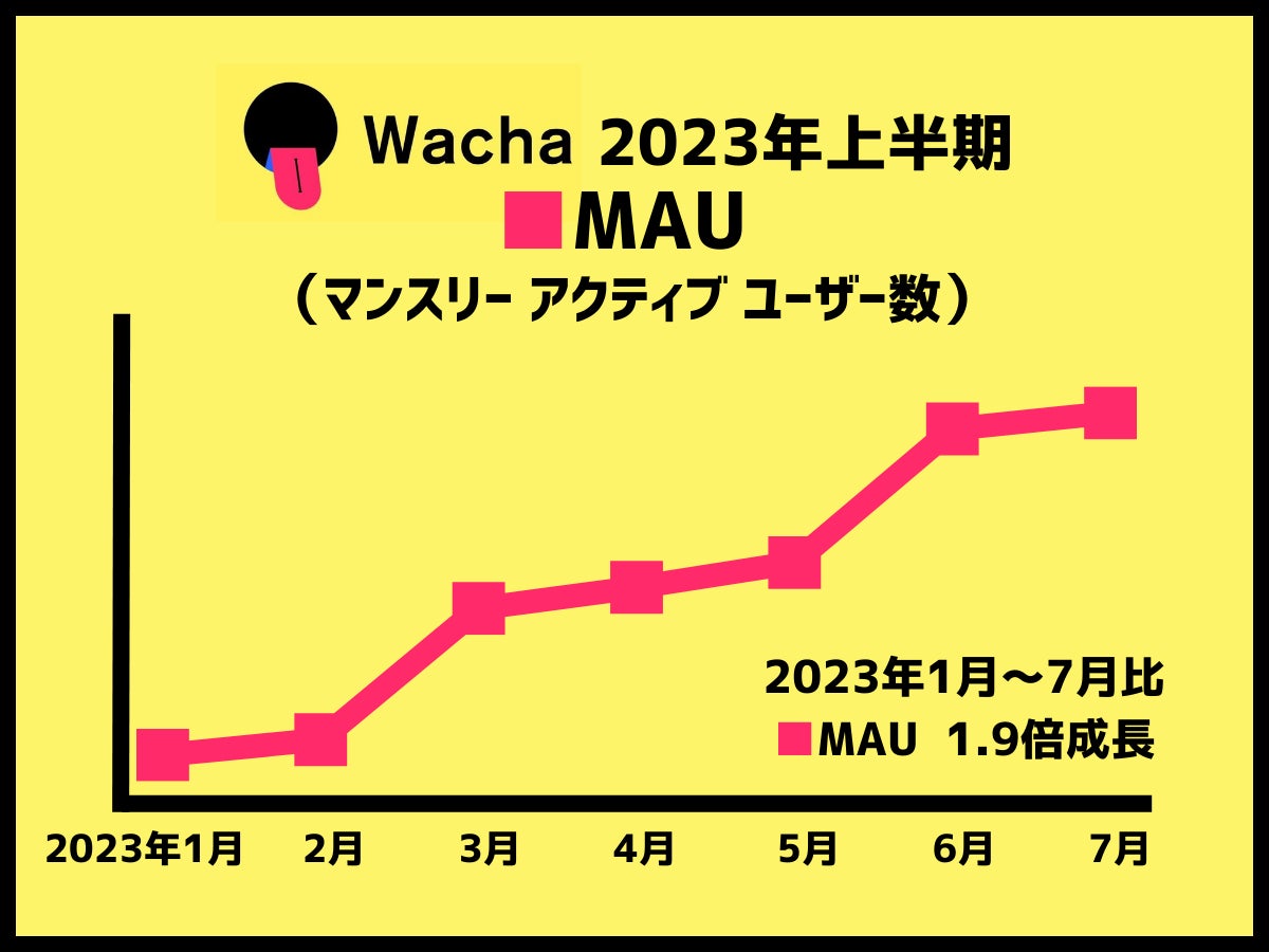 WachaアプリのMAU(マンスリーアクティブユーザー数)は、2022年10月以降の「貢献報酬」システム導入後、2023年1月から7月の7ヶ月間で1.9倍成長しました。これは、アプリを月間アクティブに利用するユーザー数が前年と比較して1.9倍に増加したことを示し、Wachaコミュニティの活性化とアクティビティの増加を反映しています。