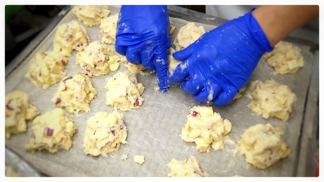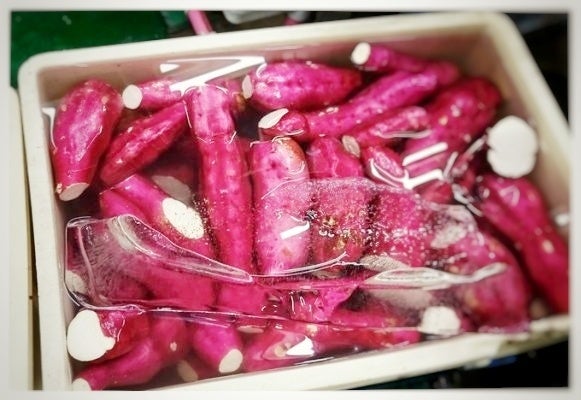 さつまいもは気温が高いと傷みやすいので、氷水で十分に冷やして鬼まんじゅうに使用します。