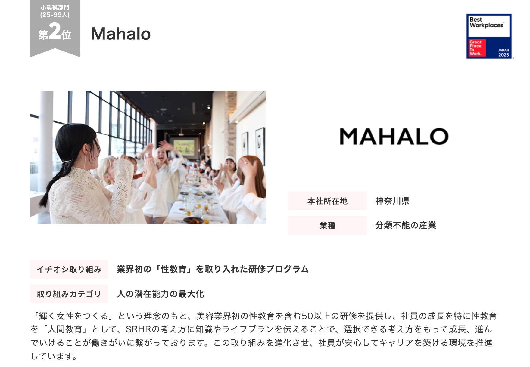 株式会社Mahalo(本社:神奈川県横浜市、代表取締役:松井裕香、以下Mahalo)は、Great Place to Work® Institute Japanが発表する「働きがいのある会社」ランキング2025(小部門)において第2位に選出されました。 さらに、2025年版「働きがいのある会社」女性ランキングにおいて「第1位」を獲得し、W受賞となりました。