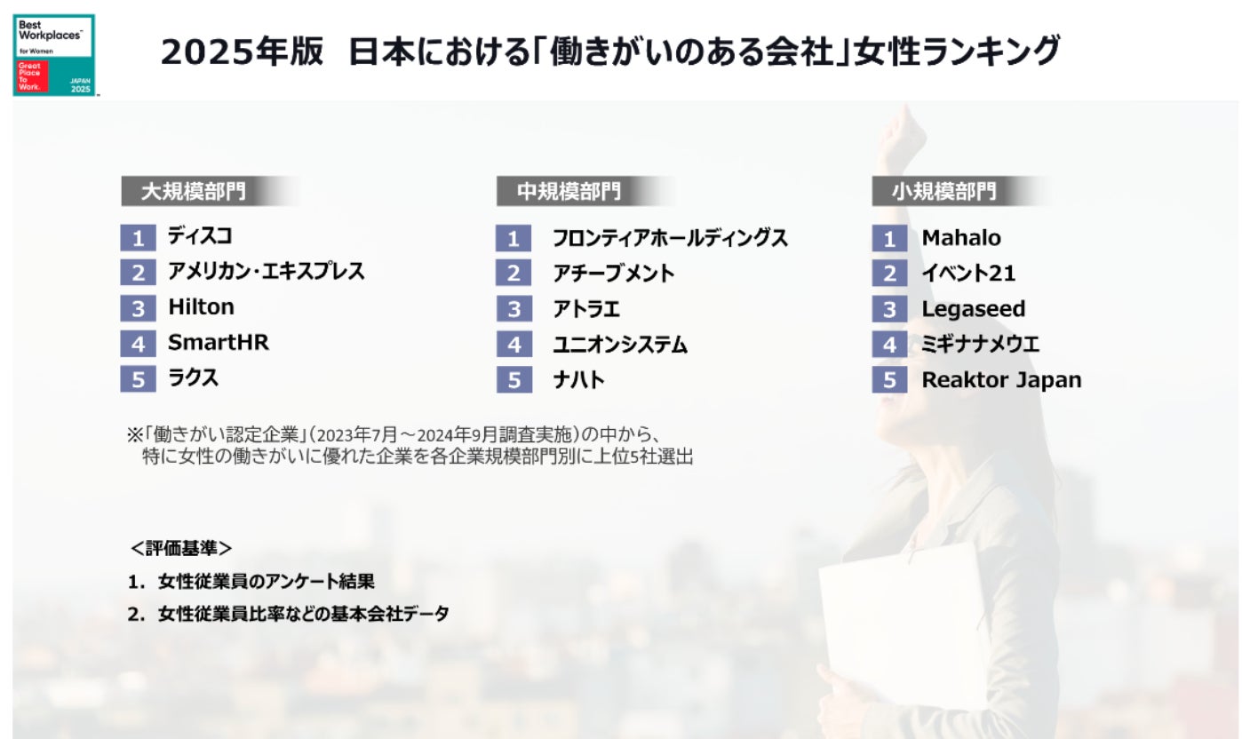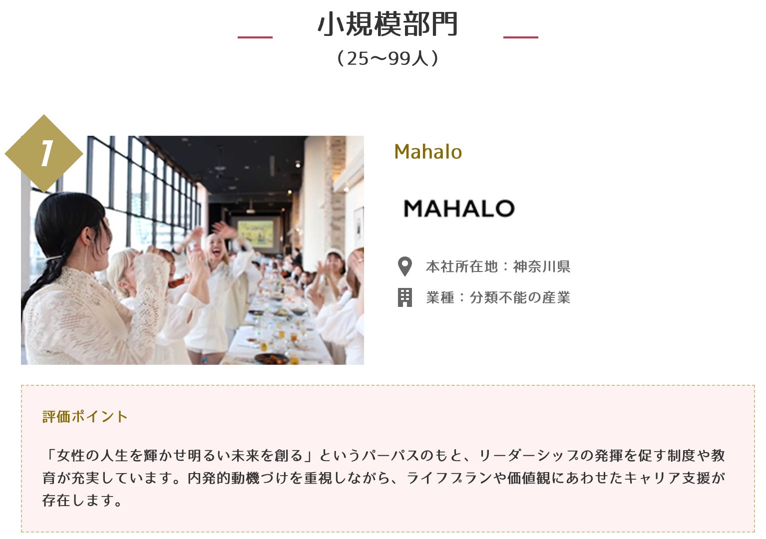 株式会社Mahalo、日本における「働きがいのある会社」2025ランキングでW受賞!~女性が輝く職場環境を提供し、小規模部門|女性ランキング「第1位」ベスト100「第2位」に輝く~