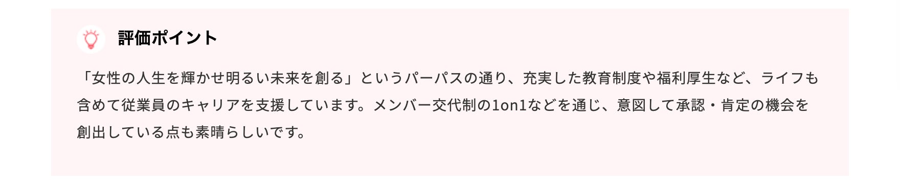 「女性の人生を輝かせ明るい未来を創る」というパーパスの通り、充実した(内面)教育制度(リーダーシップ・キャリア・性教育)や福利厚生など含めて従業員のキャリアを支援しています。メンバー交代制の1on1などを通じ、意図して承認・肯定の機会を創出している点など、Mahaloの取り組みを評価いただきました。