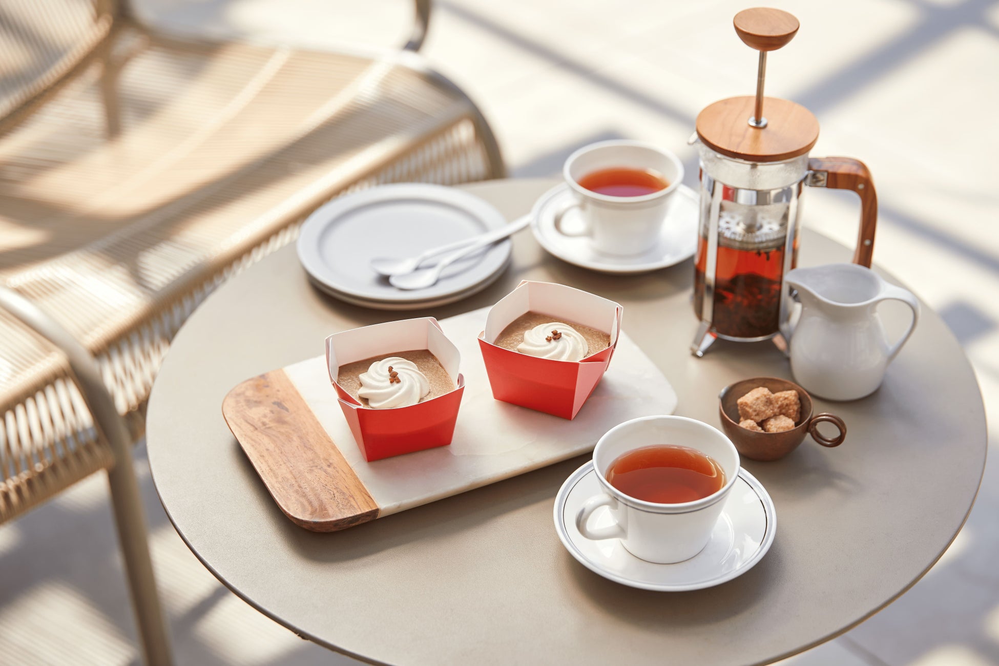 動物性原材料不使用。簡単便利なカップ入りデザート。豆乳原料にアールグレイの茶葉を混ぜ込んで作ったムースにアールグレイ風味のゼリー、クリームをトッピング。米粉とアーモンドで作ったクランブルが食感のアクセントになっています。