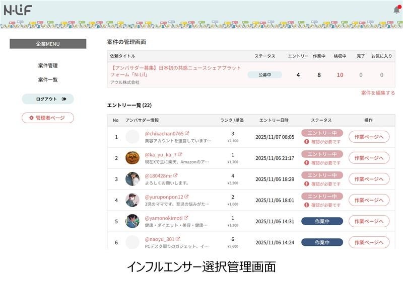 ブランディングから、イベント、デジタル領域まで、エンゲージメントを創造するPR会社のアウル株式会社(本社:東京都港区、代表取締役 CEO:北村俊二、以下アウル)は、インフルエンサーがプレスリリース(以下、リリース)をXで拡散するプラットフォーム「N-Lif(エヌリフ)https://www.n-lif.com」を、2025年11月11日よりサービス開始します。
