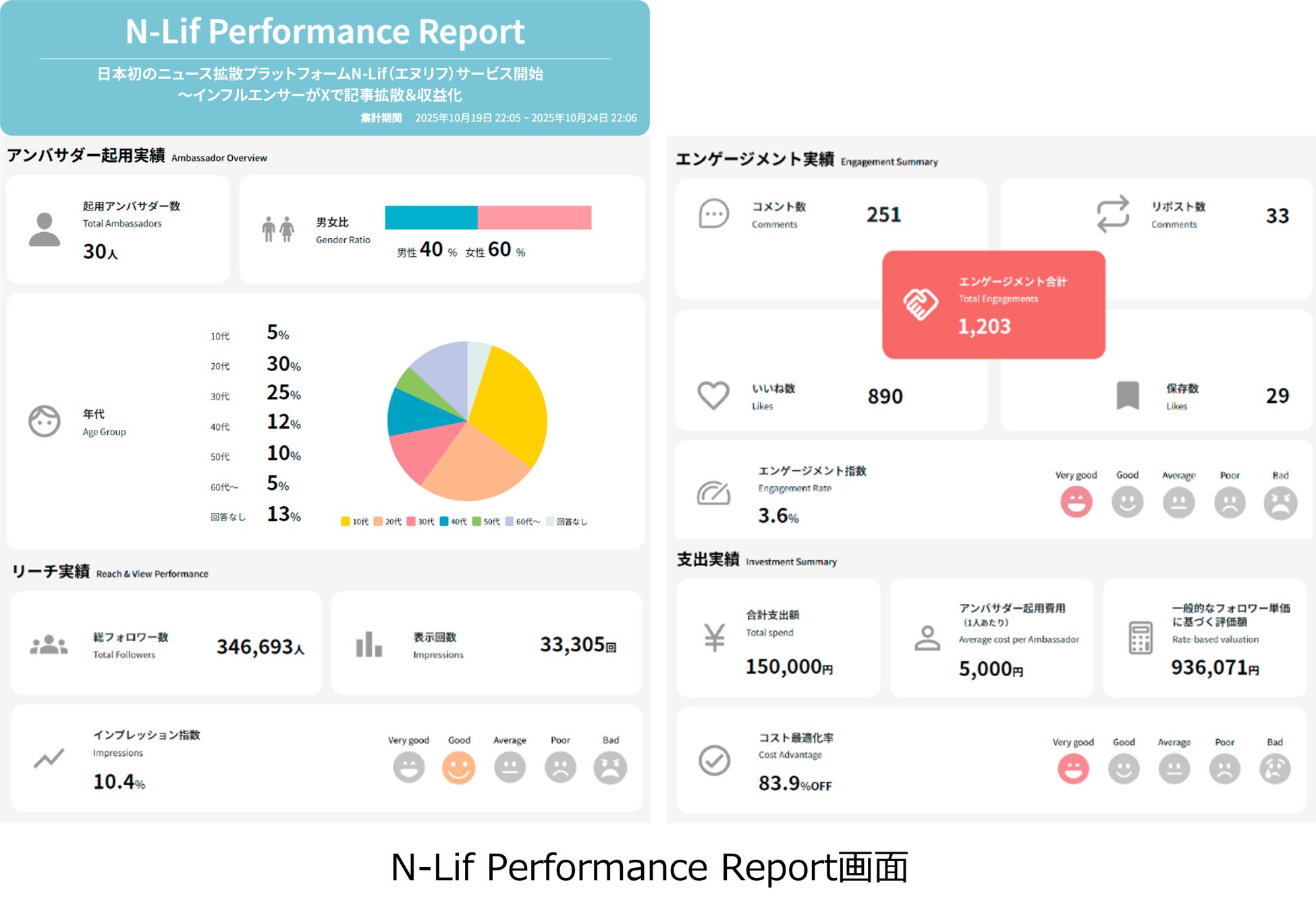 企業の広報PR活動において、リリースは依然として重要な発信手段でありながら、発信後の情報拡散や共感の広がりを可視化することはこれまで困難とされてきました。 N-Lifは、リリース配信後の成果をデータで可視化するレポート機能「N-Lif Performance Report」を搭載しました。本レポートでは、リリース配信後にインフルエンサーがどのように情報を拡散し、どの程度のエンゲージメント(コメント・リポスト・いいね・保存)を生み出したのかを詳細に分析。アンバサダーの属性(性別・年代)や投稿パフォーマンス、費用対効果などを包括的に把握することができます。インプレッション、