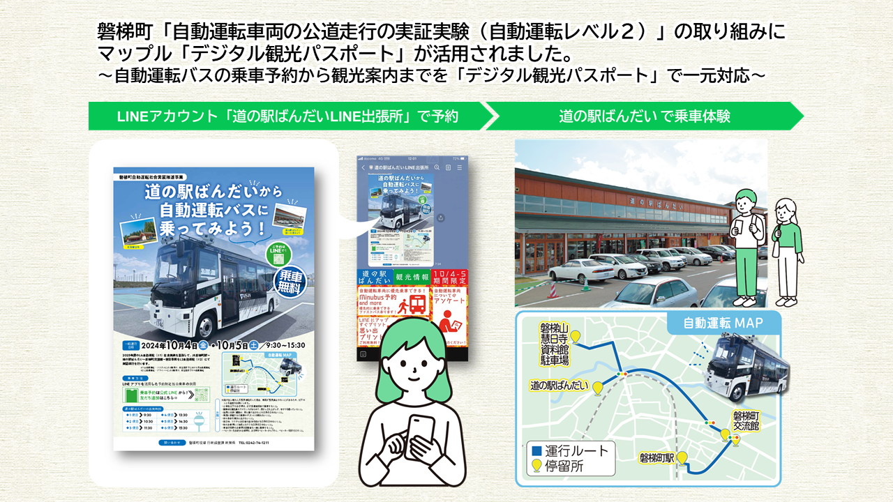 株式会社昭文社ホールディングス (本社:東京都千代田区、代表取締役社長 黒田茂夫、東証コード 9475、以下、昭文社ホールディングス)の子会社である株式会社マップル (本社:同上、代表取締役社長 大日方祐樹、以下、マップル)は、2024年10月4日(金)、5日(土)に福島県耶麻郡磐梯町の”道の駅ばんだい”で実施された自動運転車両の公道走行実証実験(以下、本実証実験)において、マップルの「デジタル観光パスポート」が自動運転車両予約のタッチポイントとして活用されたことをお知らせいたします。