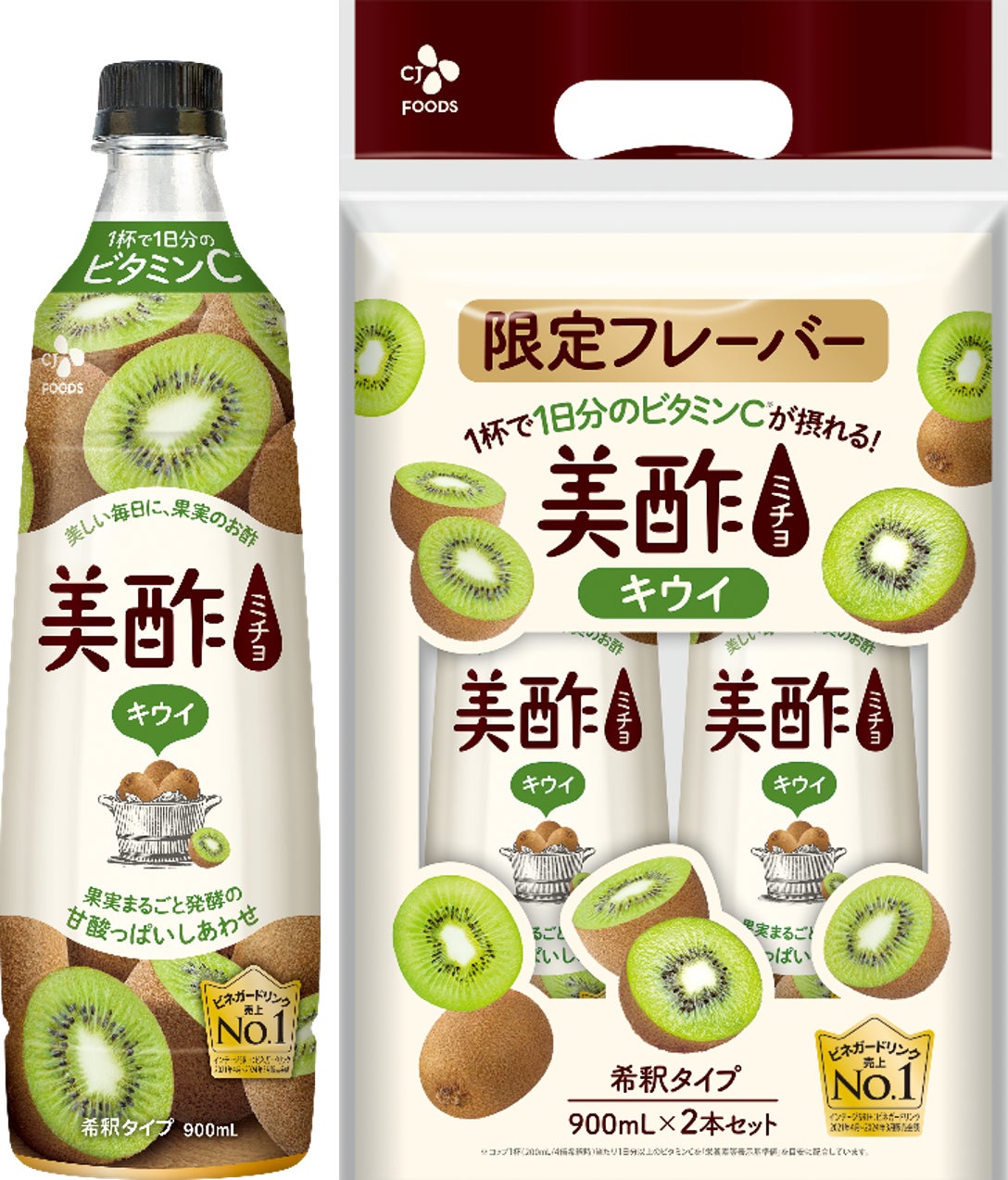 美酢は、100%果汁をじっくり発酵させて作った果実発酵酢を使用した、まろやかな味わいのビネガードリンクです。この度新たに販売を開始する「美酢キウイ」は、コップ1杯で1日分のビタミンC※1を採ることができ、キウイのフルーティーな甘みと果実酢のすっきりとした酸味をお楽しみいただけます。