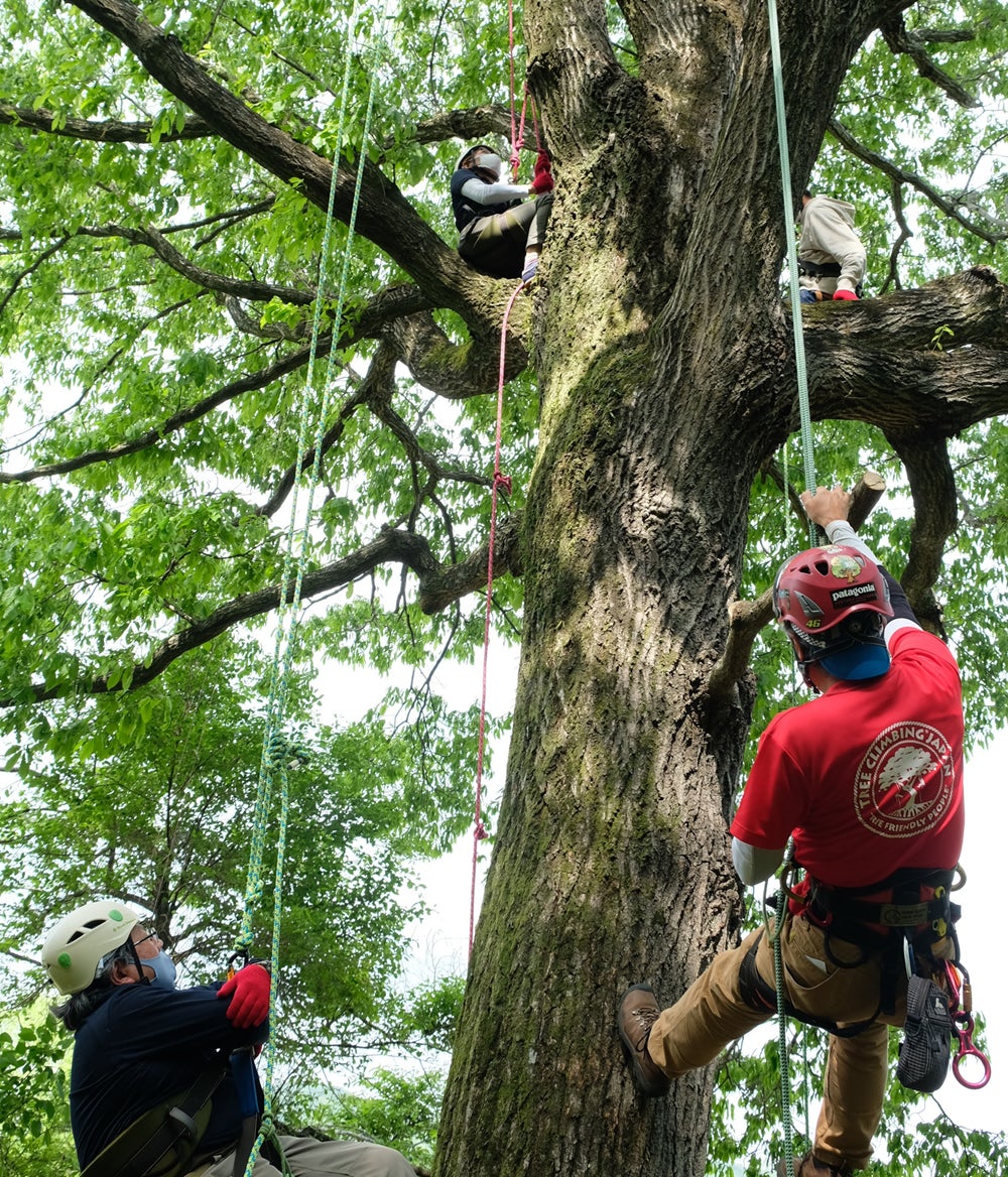 小学生から大人までが、樹木に親しみながら心地よく全身運動を楽しめる木登りアクティビティ「ツリークライミング」体験(60分)。
