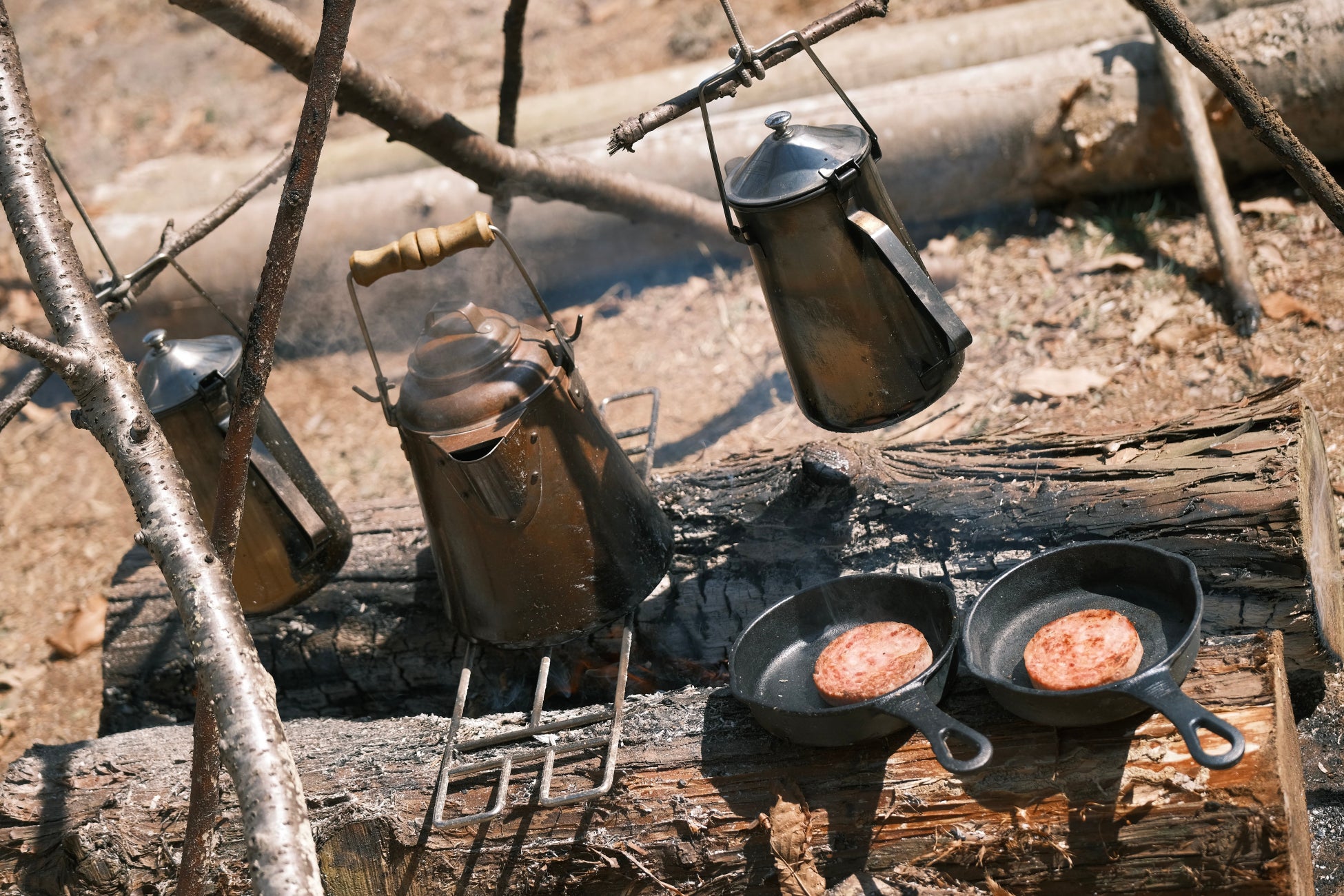 スタッフが用意した焚火で、手作りボローニャハムステーキやマシュマロのほか、ご自身で豆を挽くコーヒーなどをご用意。
