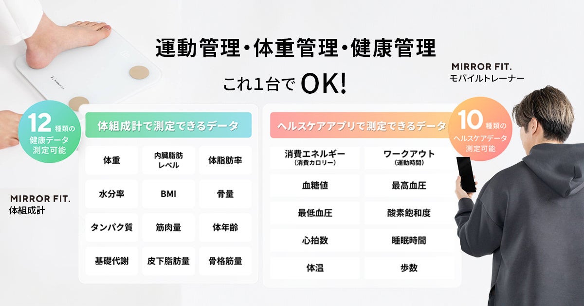 特に「MIRROR FIT. モバイルトレーナー」は、Bluetoothで接続し「MIRROR FIT. スマート体組成計」で計測すると、【体重、内臓脂肪レベル、体脂肪率、水分率、BMI、骨量、タンパク質、筋肉量、体年齢、基礎代謝、皮下脂肪量、骨格筋量】の12項目のデータが取得できます。さらにスマートフォンのヘルスケアアプリから取得できる、【消費エネルギー、ワークアウト(運動時間)、血糖値、最高血圧、最低血圧、酸素飽和度、心拍数、睡眠時間、体温、歩数】の10項目も集約ができ、トータルで22項目管理が可能です。累計約9,000名(2024年10月8日時点)がダウンロードしており、現時点の健康状態を数値化し「見える健康スコア」としてたくさんのユーザーから好評を得ております。