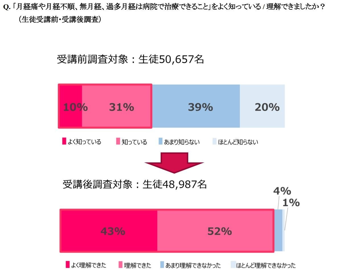 受講生徒からは「女性だけでなく男性にも知識が広まって、恥ずかしがることや嫌になることがない世の中になってほしい(女子生徒)」「将来、パートナーができたときに、サポートできるような人になりたいと思った(男子生徒)」といった感想が寄せられました。3)さらに受講前・後に「月経痛や月経不順、無月経、過多月経は病院で治療できることを知っているか」を尋ねたところ、医療機関で治療できることの認知度は受講前と比べ約2.3倍に増加しました。このことからも「かがやきスクール」の授業により、ヘルスリテラシーが向上していることがわかりました。詳細は【かがやきスクールアンケート調査 概要】をご参照ください。