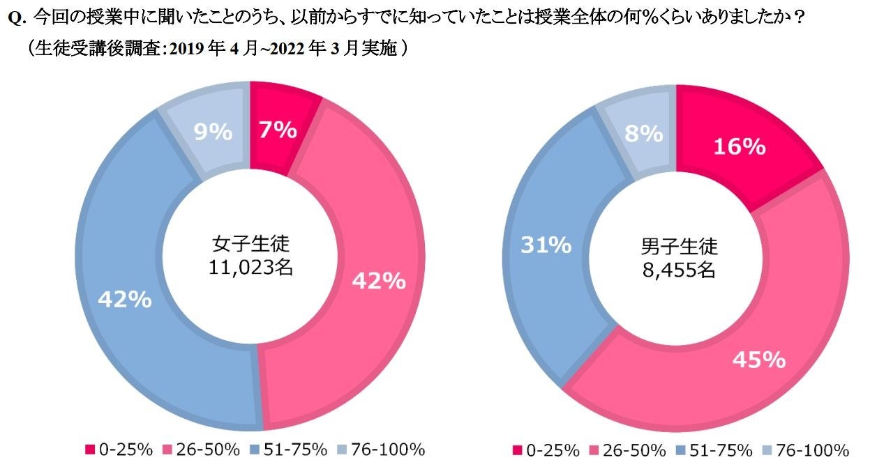 - 約5割の女性生徒、約6割の男子生徒が「半分以上が初めて知る内容だった」と回答