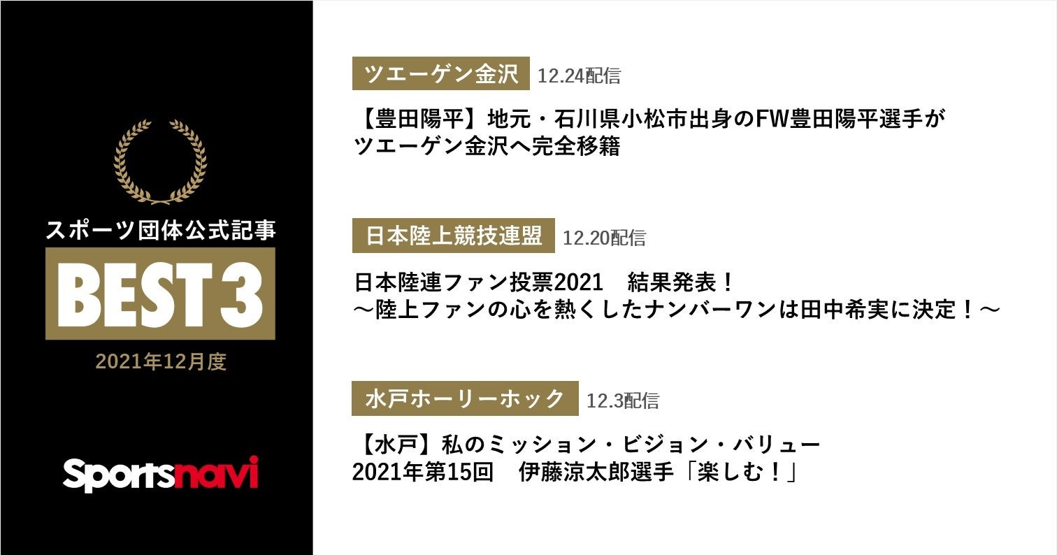ツエーゲン金沢、日本陸上競技連盟、水戸ホーリーホックが受賞! スポーツ団体公式記事月間ベスト3(21年12月度)