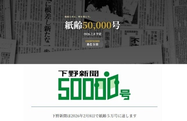 株式会社下野新聞社(本社:栃木県宇都宮市、代表取締役社長:若菜英晴)は、2026年2月8日(日)付で、新聞の発行号数である「紙齢」が5万号を迎えます。1878(明治11)年6月1日の創刊以来、147年間余りにわたって発行を続け、郷土・栃木の歴史や暮らし、県民の喜びや悲しみを記録してきました。この大きな節目を記念し、読者への感謝を伝える特別紙面の発行と記念キャンペーンを実施します。