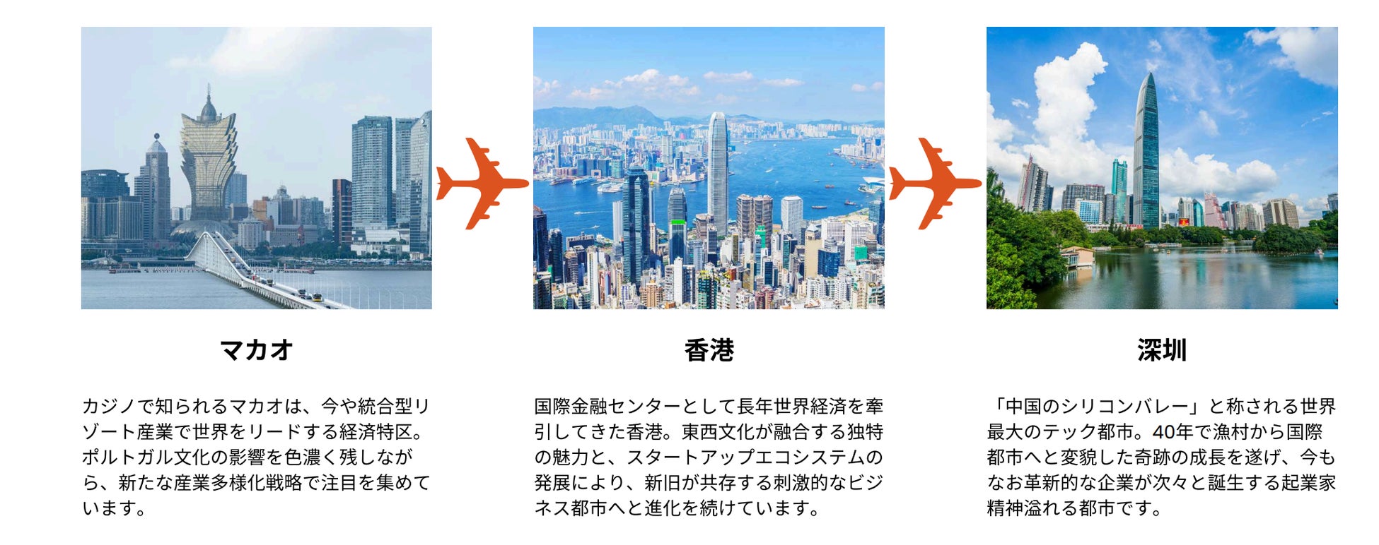 深圳は「中国のシリコンバレー」と呼ばれ、テンセントやBYDなど世界的企業が集積する都市であり、香港は国際金融のハブ、マカオは国際展示会拠点として機能しています。
