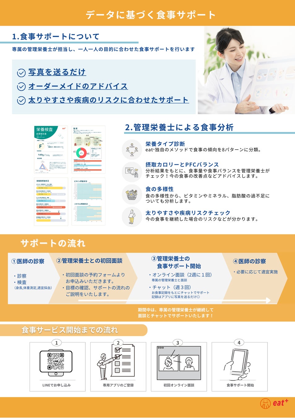 データを活用したパーソナル食事指導アプリ「eat+」を開発しており、クリニックや企業の従業員様向けに管理栄養士による食事指導を提供しています。イータスが独自に開発した「タイプ別×コーチング」の栄養管理メソッドをコミュニケーションツール化し、オンラインでも効果的な食事指導を実施しています。