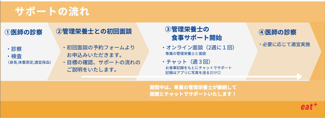ダイエットや健康診断の結果が気になる方向けに、管理栄養士による食事のパーソナルトレーニングサービスを提供しています。パーソナル食事指導アプリ「eat+」を活用して、管理栄養士が伴走し、1ヶ月で食習慣の基盤を築き、2ヶ月で体重や体感に変化を感じ始め、3ヶ月で結果を出すプログラムを提供しています。