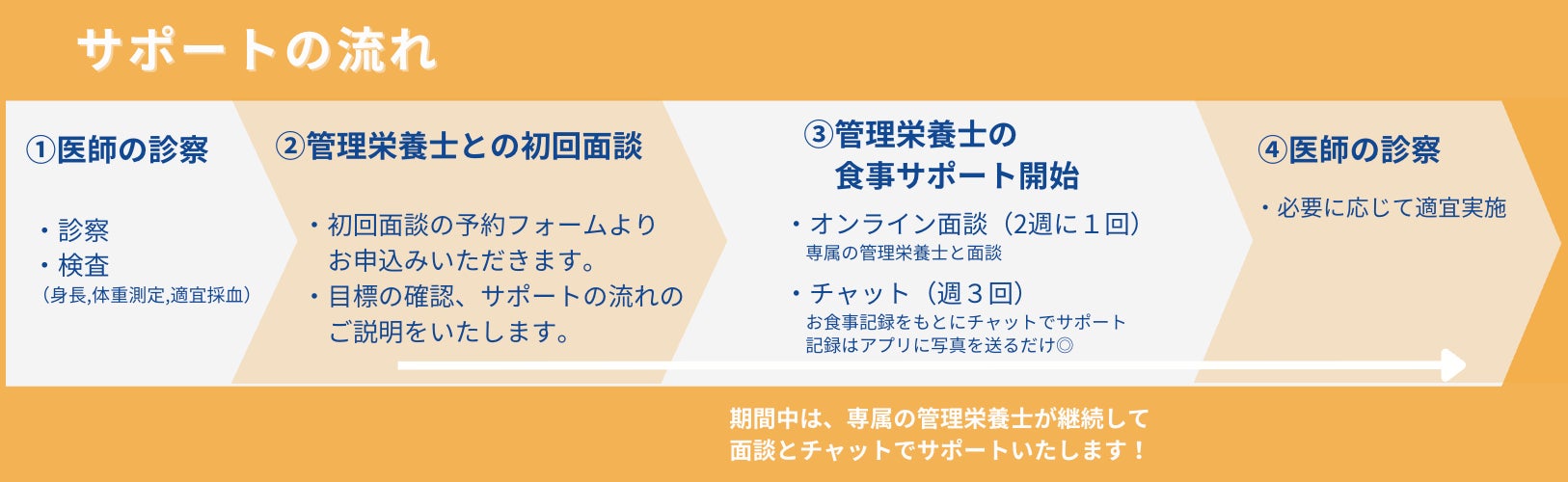 医師による診察、検査(身長、体重測定、適宜採血)と目標設定を行い、その後管理栄養士による食事サポートをオンラインで受けられます。期間中は、専属の管理栄養士が継続して面談と専用アプリでのチャットを行い、目的に合わせたパーソナライズされた食事サポートを提供いたします。