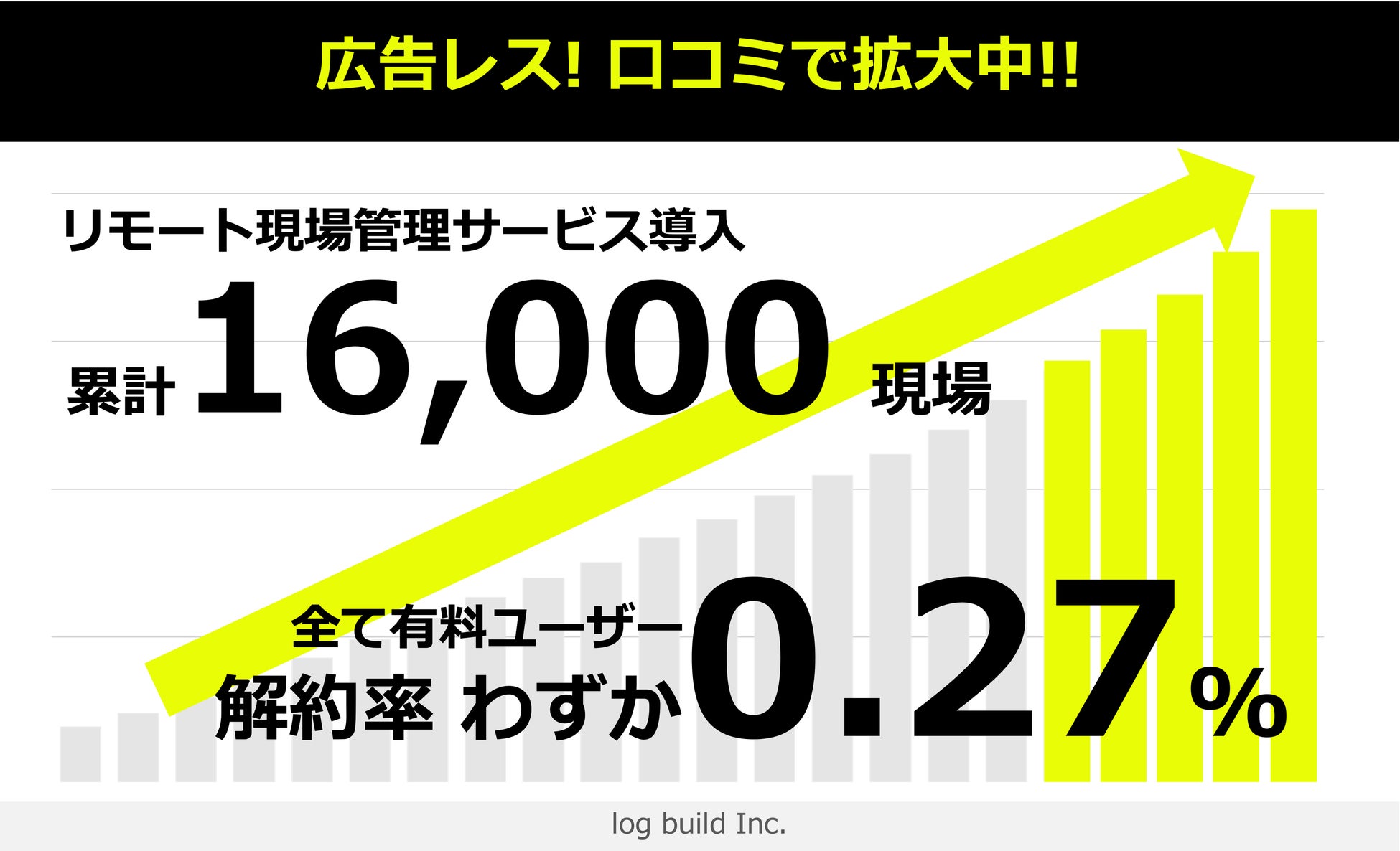 ログビルド、遠隔現場管理サービスの「Log System」が、広告レスの口コミで拡大中!2年で16,000現場到達し、ビルダーの解約率もわずか0.27%(全顧客 有料ユーザー)