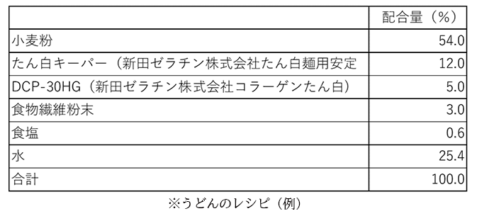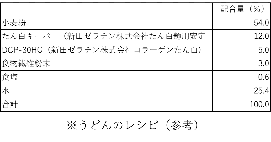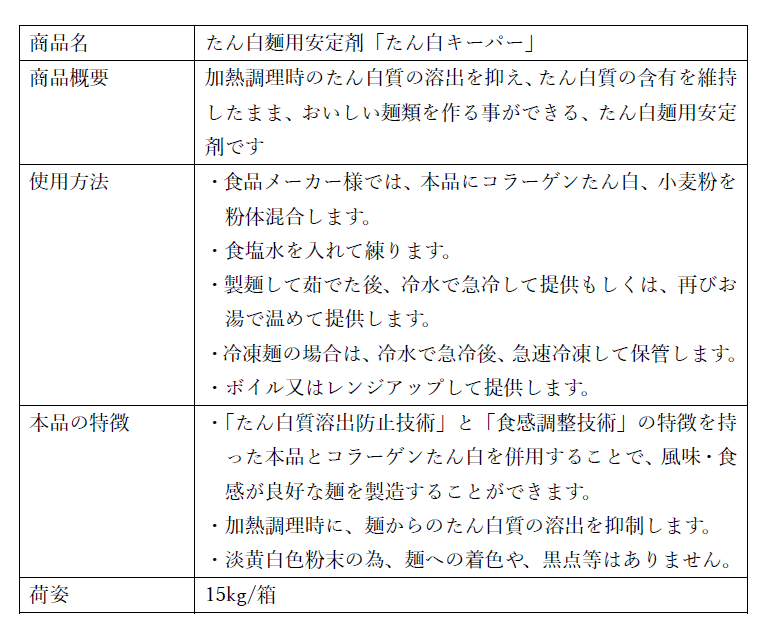 これに対し、新田ゼラチン株式会社が開発した「たん白キーパー」(以下「本品」という)は、コラーゲンたん白との併用により、たん白質を含む麺製品の製造ができるたん白麺用安定剤です。