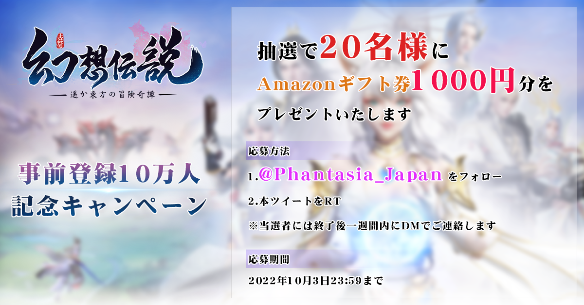 これは数万年前から受け継がれてきた伝説の物語ーーUjoy Gamesは本日(2022年9月27日)、マルチオンライン RPG「幻想伝説 〜遥か東方の冒険奇譚〜」の事前登録者が10万人を突破したことを発表しました。また、これを記念してTwitterではAmazonギフト券が当たる、RT+フォローキャンペーンを実施。加えて、日本限定職業・九尾の狐「玉藻」についての新情報を公開しました!