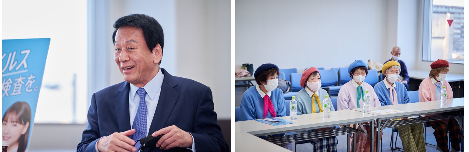 泉大津市のダンス健康クラブ登録シニアチーム「まかろん♪」の皆さんとの対談で、同席した東京大学先端科学技術研究センターの宮﨑先生は、「東京大学では、地方自治体やコミュニティで困っていることを研究で解決する、リビングラボを行っています。こちらの泉大津市では、高齢者の健康寿命を延ばすことを目標とし、特に“認知機能低下を改善する”ためにダンスで認知症を予防する取り組みを導入させていただいています。」とダンスによる健康づくりの研究を推進していることについて話しました。