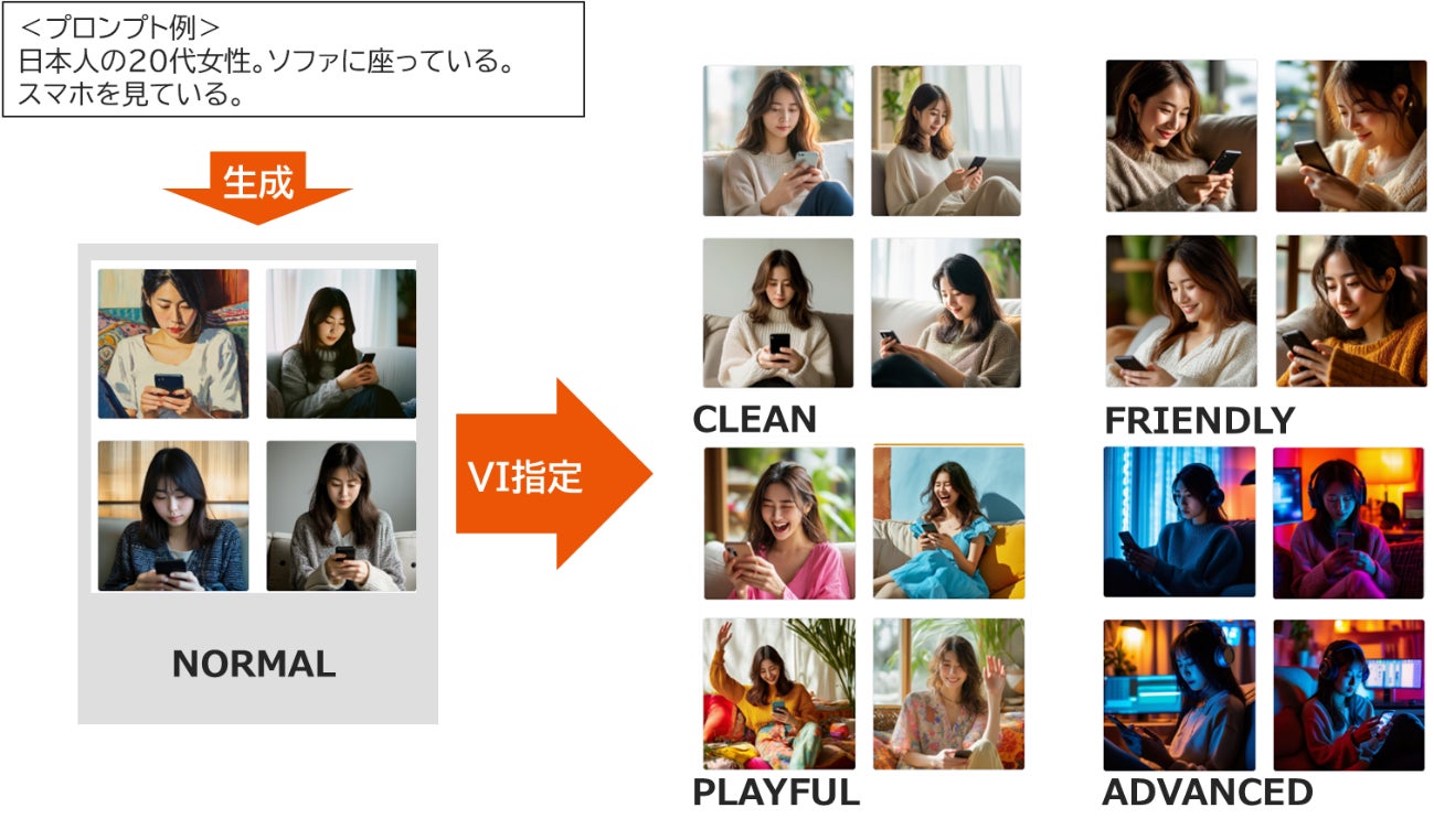 本システムでは、画像生成プロンプトの入力後に「au VISUAL IDENTITY」の写真規定で定義された4つの付加価値(CLEAN、FRIENDLY、PLAYFUL、ADVANCED)のいずれかを選択するだけで、自動的に生成画像に反映が可能です。