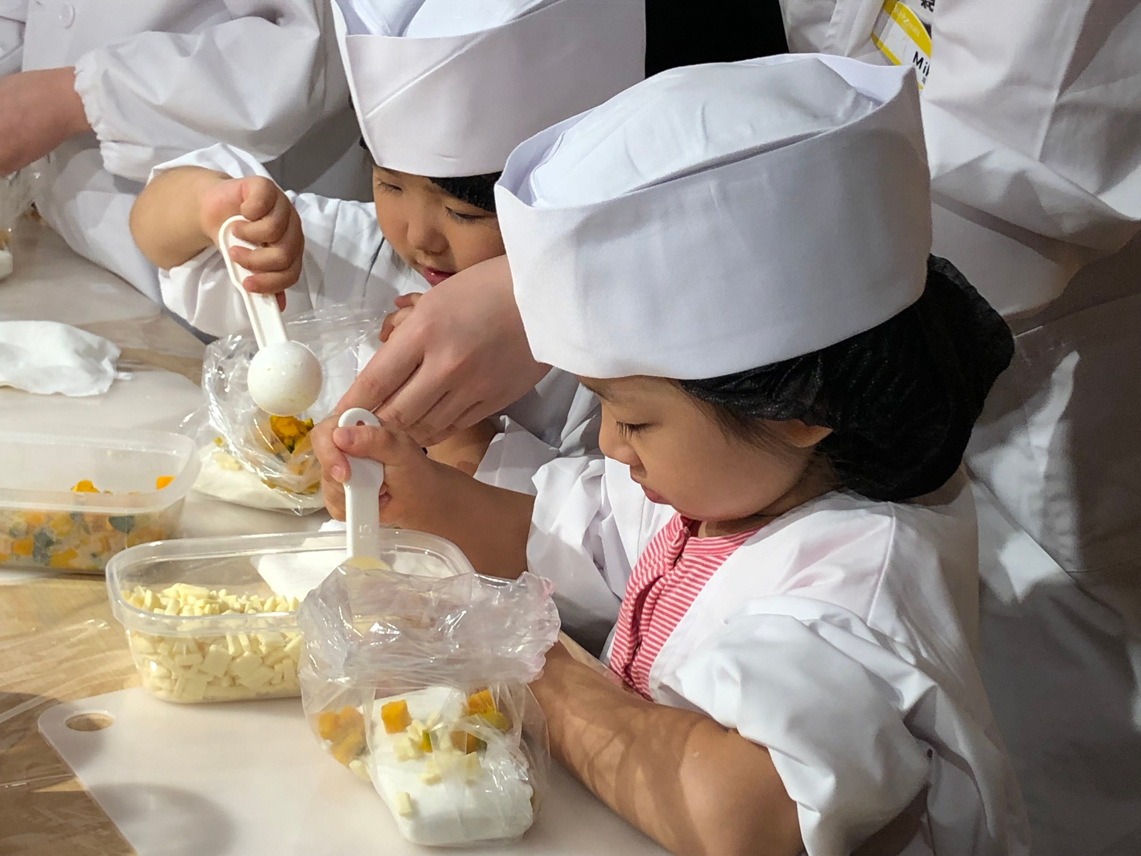 「はんぺん工房」パビリオンでは、こども達が「はんぺん職人」として、練り製品の作り方を学び、はんぺんを使った手軽においしくできる調理体験を通じて、練り製品の魅力やおいしさを多くの人に伝えます。3年ぶり4回目の開催となる今回は「はんぺんの揚げないカニコロッケ風」の調理体験に挑戦します。
