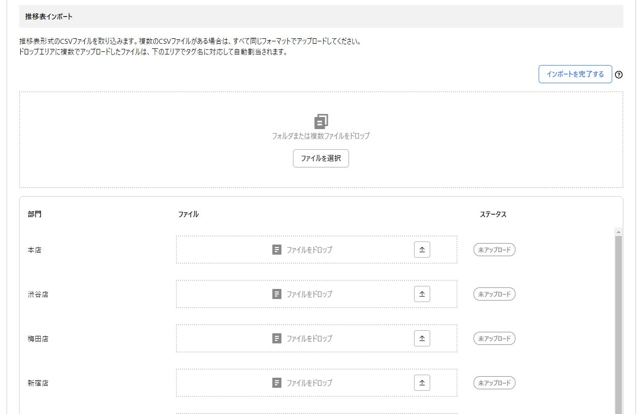 複数のCSVファイルの取り込みが一括で可能なため、部門別の損益計算書データを簡単にインポートできます。