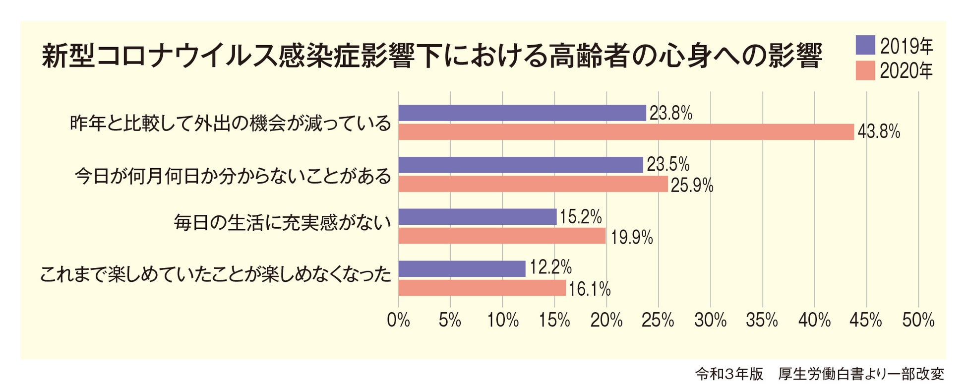 厚生労働省が発表した資料によると、新型コロナウイルス感染症が流行する前の2019年と流行後の2020年を比較すると、流行後は高齢者(75歳以上対象)の外出機会が減少し、認知機能の低下やうつ傾向が見られた方の割合が増加傾向にあることが分かります(下図参照)。