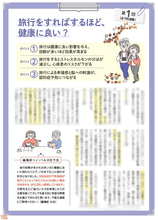 人生100年時代、「旅行による幸福感」が認知症予防のカギ?連載「心と体の健康に良い旅行とは」、宿泊情報誌「ゆこゆこ」10月号よりスタート