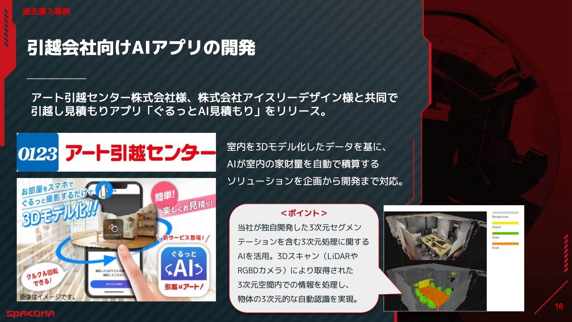 例えば、LiDARやRGBDカメラといった高度な3Dスキャン技術を活用し、室内空間を解析して自動で見積もりを行うアプリ『ぐるっとAI見積もり』を開発し、アート引越センター株式会社に提供するなど、実用的なソリューションの提供も行っています。