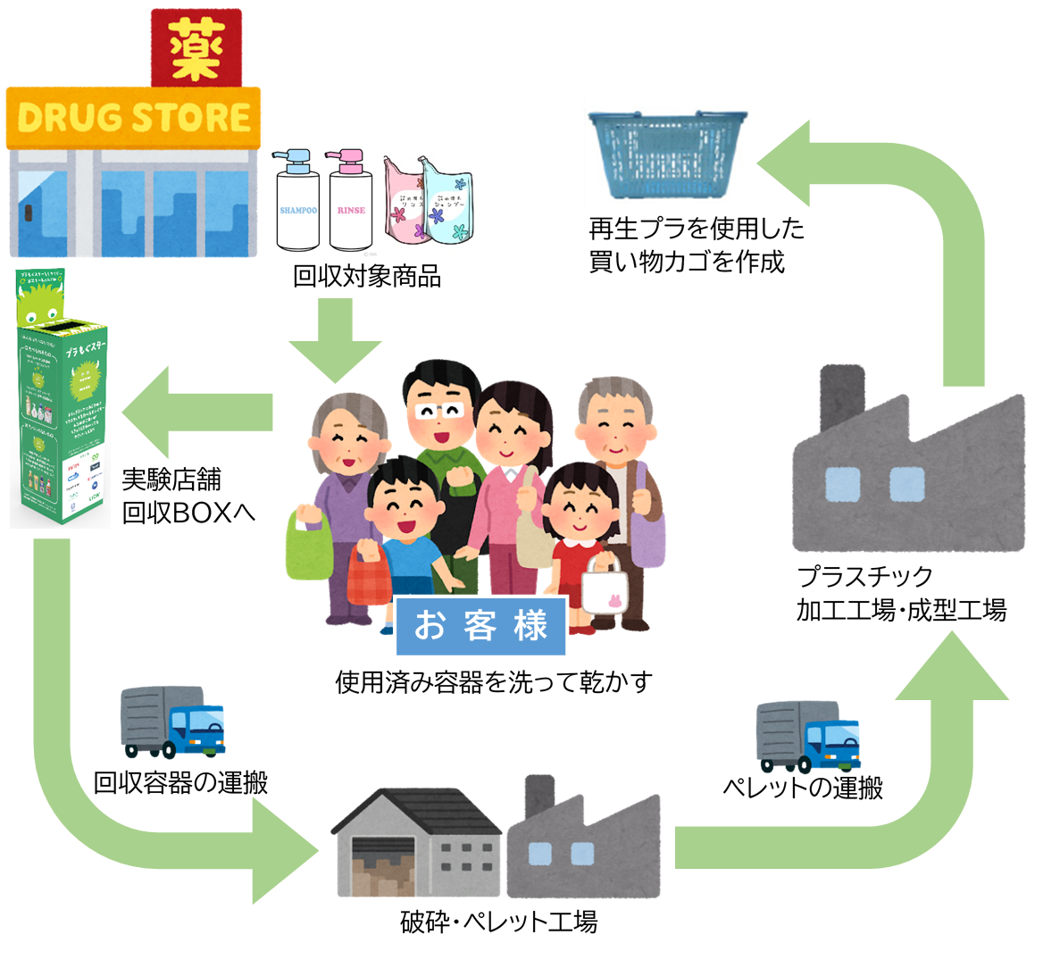 当社をはじめとした推進委員会メンバーの横浜市内のドラッグストア31店舗で使用済み包装容器を回収し、期間は6月30日から約半年間を予定しています。