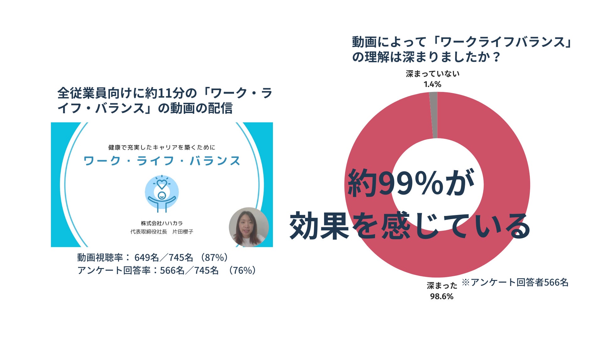 株式会社ハハカラ(本社:東京都品川区、代表取締役:片田櫻子)は、昨年度、従業員数700名規模の企業に向けて提供したライフワークバランス動画研修において、受講者の98.6%が「理解が深まった」と回答したことをお知らせいたします。