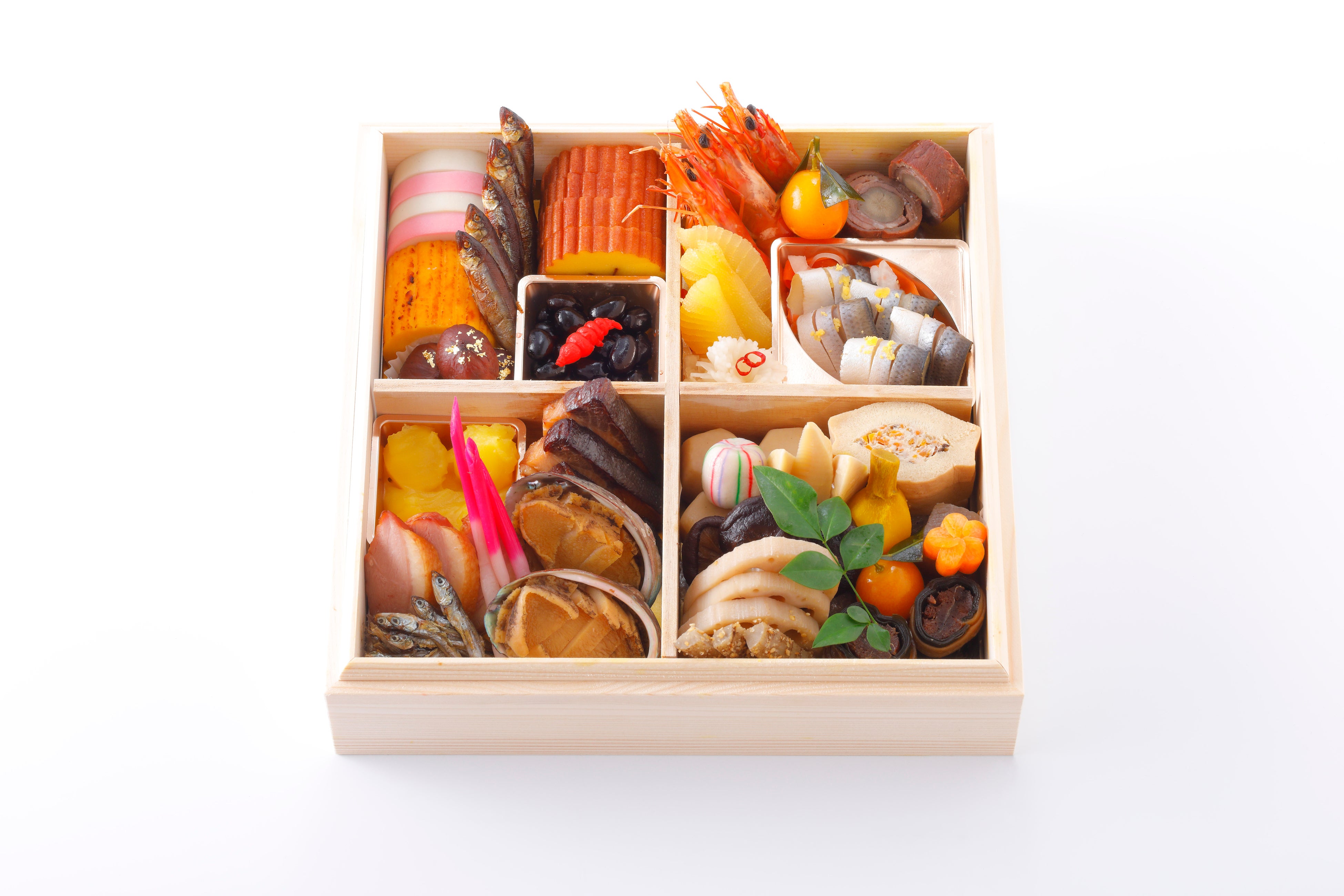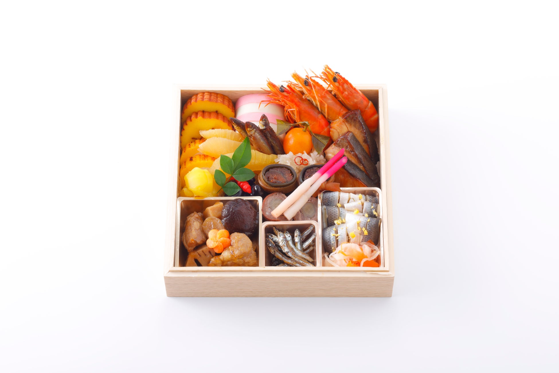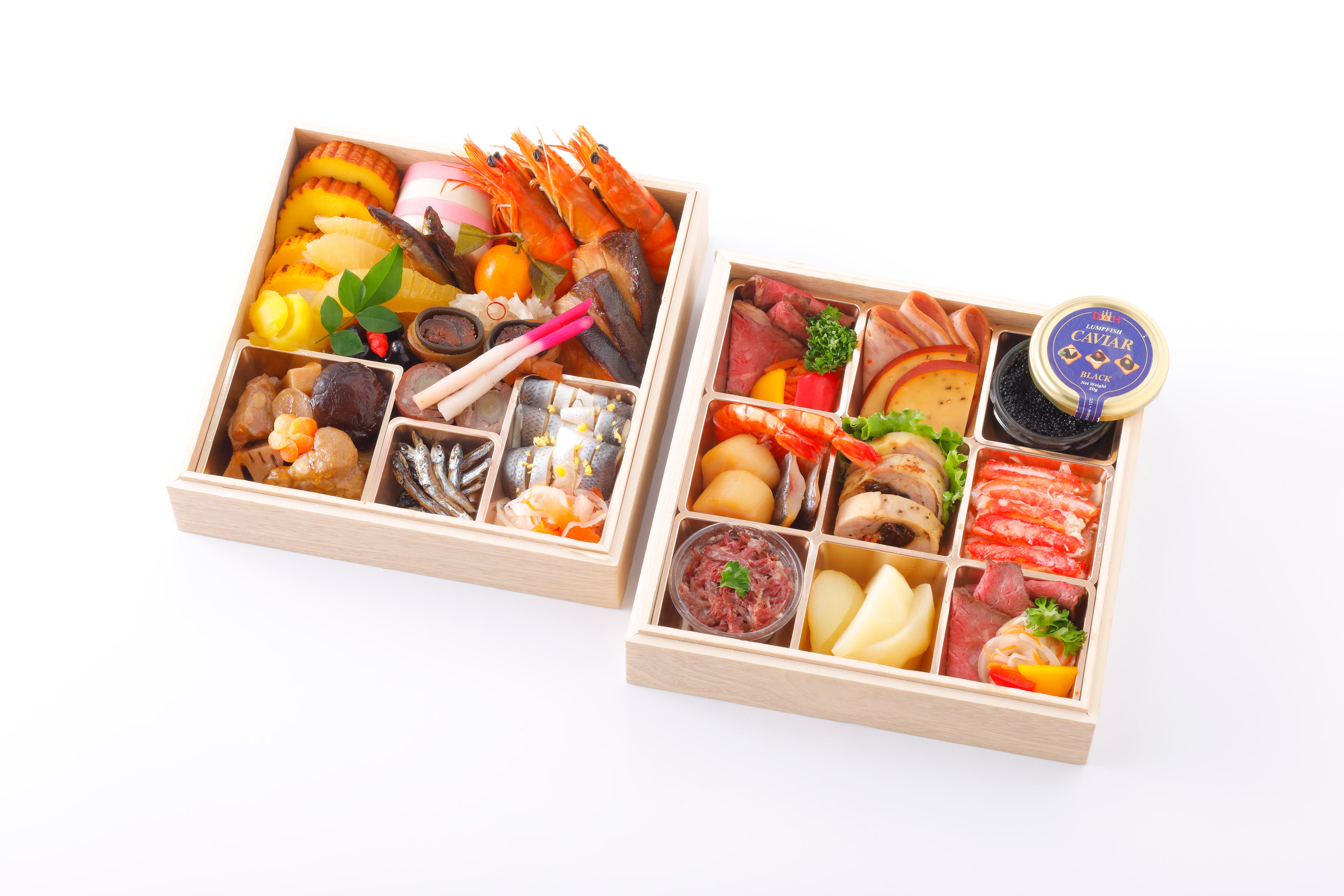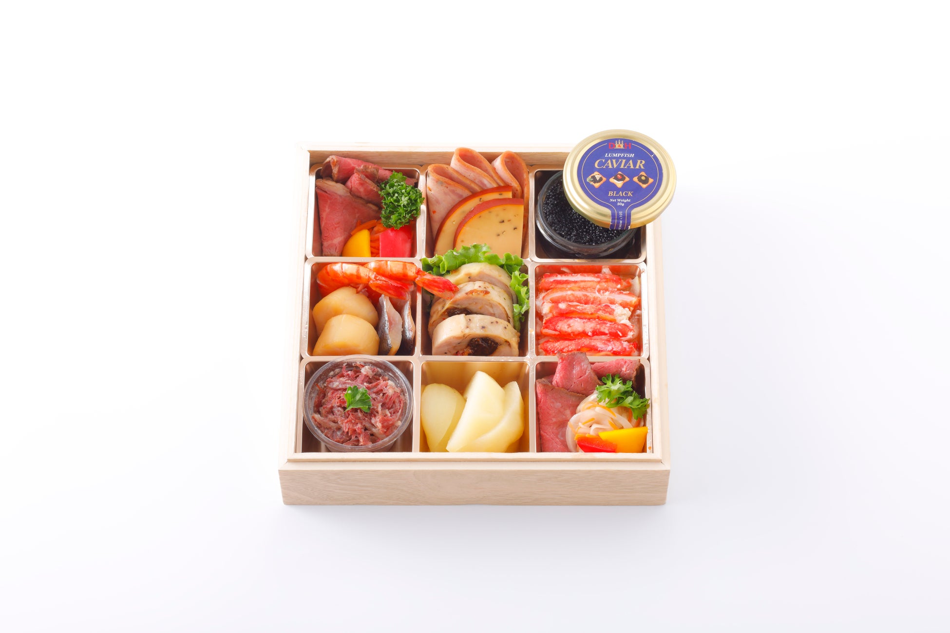 | [一ノ段]和風 紅白蒲鉾、伊達巻、錦玉子、鮎の甘露煮、丹波の黒豆(ちょろぎ)、養老海老、牛の八幡巻、数の子、菊花大根、小肌の粟漬け、紅白なます、栗きんとん、鰤の柚庵焼き、筑前煮、田作り、にしんの昆布巻き、はじかみ生姜、葉付きんかん [二ノ段] 洋風 ローストビーフ、ランプフィッシュキャビア、黒毛和牛のコンビビーフ、ペッパーソーセージ、ペッパーチーズ、知床鶏レモンペッパーロール、白桃のコンポート、蟹マリネ、スモークホタテ、甘酢海老、ニシンの燻製、野菜マリネ |
