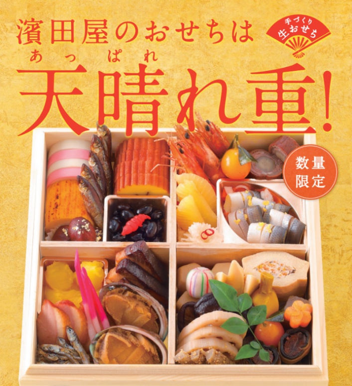 まん福ホールディングスグループのちがさき濱田屋(株式会社浜田屋 本社:神奈川県茅ヶ崎市、代表取締役社長:戸倉大輔、以下 「濱田屋」)では、10月7日(金)より2023年新春に向けたおせち祝膳の予約受付を開始いたします。濱田屋の生おせち“天晴れ重(あっぱれじゅう)”(全4種)と、同時予約受付中の濱田屋名物筑前煮とともに華やかで贅沢なお正月をお過ごしください。