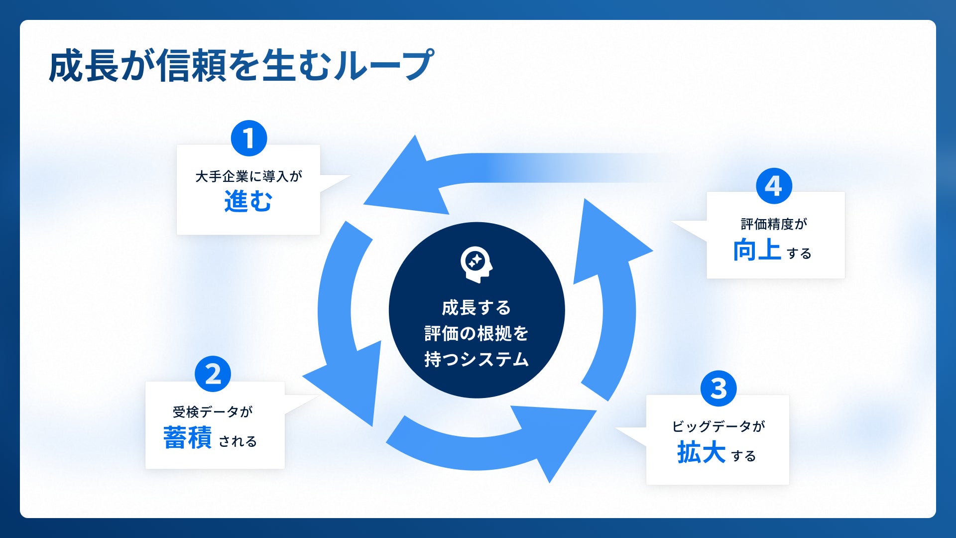 大手企業を中心に導入が進むことで、受検データが蓄積され、ビッグデータとして拡大。そのデータをもとに統計的な補正を重ねることで、評価精度が向上するという「成長が信頼を生むループ」を形成しています。