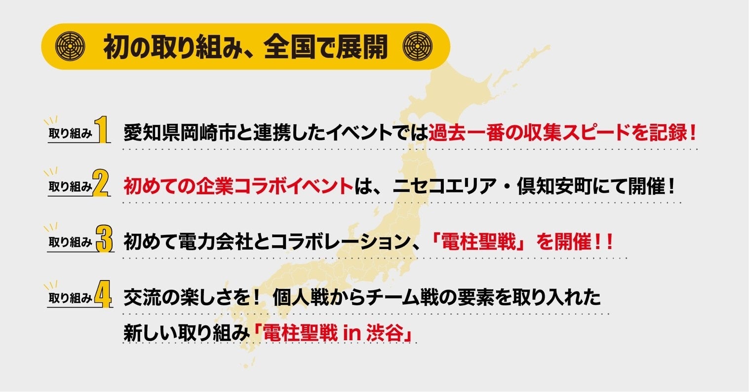 2つ目の初の取組は、企業とのコラボレーションイベント展開で、2022年10月末に北海道のスキーリゾートエリア「ニセコ」を舞台に、東急不動産株式会社、東急不動産ホールディングス株式会社と連携して「マンホール聖戦in 倶知安町」を開催しました。さらに、2022年11月から「電柱」を対象インフラとして追加、初めて電柱対象としたイベント「電柱聖戦」を、11月末に北陸3都市を対象に、北陸電力送配電株式会社と共同開催しました。企業コラボレーション先としては2社目ですが、配電設備の維持管理効率化の可能性を確認する、初の電力会社の実証実験としての取組として展開しました。
