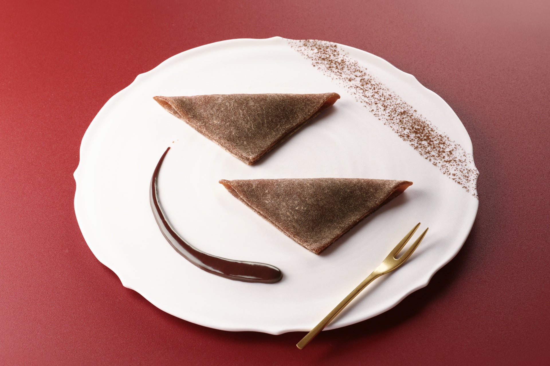 2種類のクーベルチュールチョコレートと純生クリームをあわせた口溶けなめらかなガナッシュ仕立てのチョコレートを、ココア風味の生八つ橋で包みました。2種類のクーベルチュールチョコレートをあわせる事で、カカオの風味と甘さのバランスを整えました。上品なチョコレートの味わいが口の中に広がります。