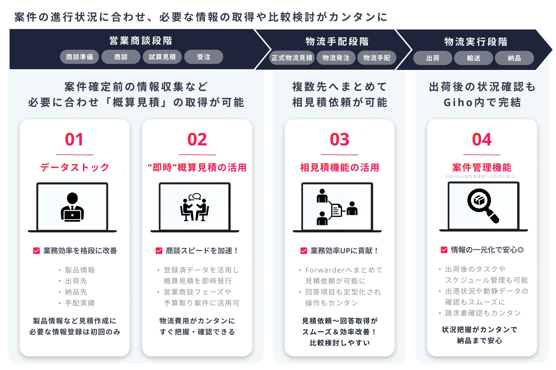これまでWillboxのデータベースに基づいた見積りのみだったところ、複数のフォワーダーが直接参画することで荷主企業の物流手配の選択肢の拡充をサポート。