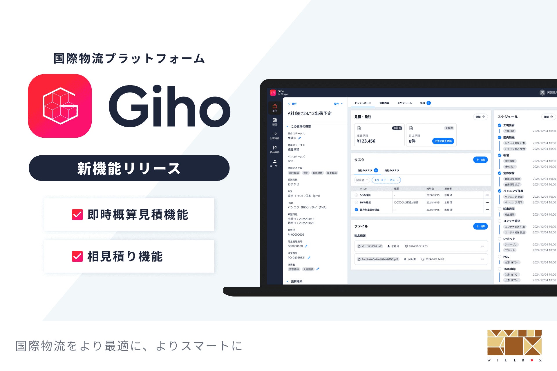 国際物流プラットフォームを提供するWillbox株式会社(本社:神奈川県横浜市、代表取締役:神 一誠)は、国際物流の見積・発注プロセスを根本的に変革する「Giho」のリニューアル版を正式リリースいたしました。本リニューアルでは、新たに「即時概算見積機能」と「相見積機能」を搭載し、荷主企業、フォワーダー、物流事業者にとって、より利便性の高い物流手配環境を提供いたします。