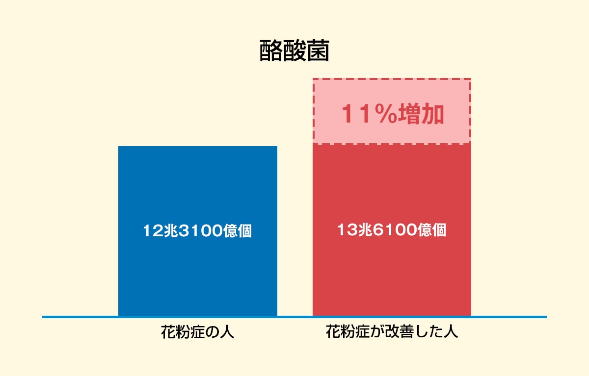 菌ドックで検査を受けられた約2万人の腸内細菌検査データをもとに花粉症との関連を調査。その結果、「花粉症が改善した人」は「改善していない人」と比べ、腸内の乳酸菌が約2,300億個も少ないことが判明しました。