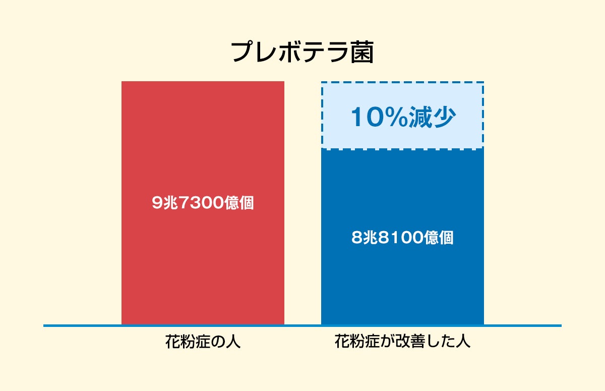 このプレボテラ菌が、花粉症が改善した人は改善していない人に比べて約10%減少していたことから、複数の腸内細菌を取り込み多様性指数を上げることは、花粉症対策に有効である可能性が考えられます。