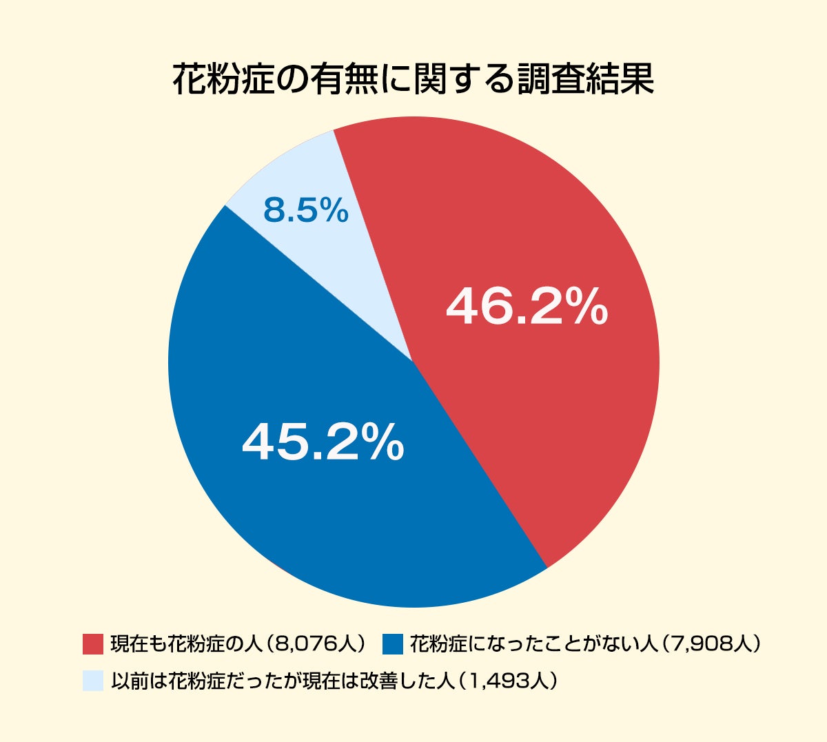 対象の内訳は「花粉症になったことがない人」が7,908人、「現在も花粉症の人」が8,076人、「以前は花粉症だったが現在は改善した人」が1,493人でした。