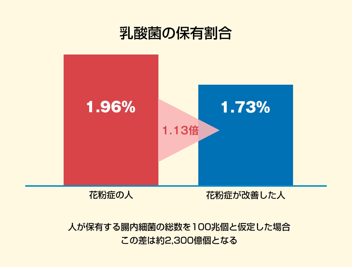 乳酸菌の保有割合は改善した人で約1.73%、改善していない人で1.96%と1.13倍の違いが生じ、人が保有する腸内細菌の総数を100兆個と仮定した場合、この差は約2,300億個となる。腸内細菌の総数が40兆個とする説を採用しても、差は約920億個に上ります。
