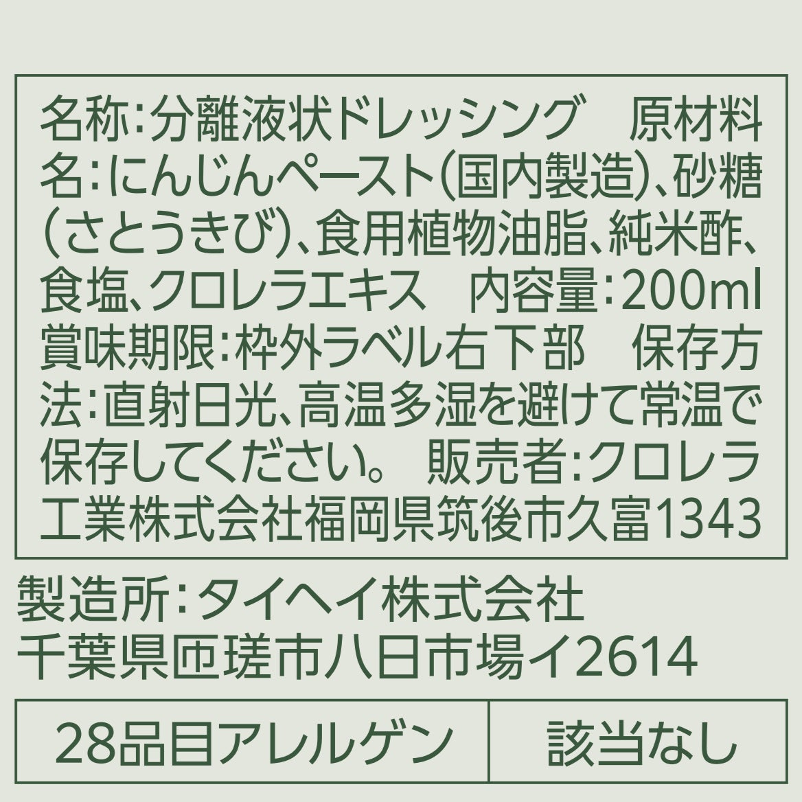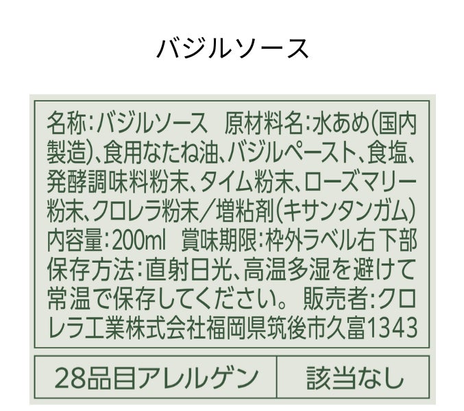 バジルソースには、原材料のバジルや筑後産クロレラを均一になじませ、より美味しくお召し上がりいただけるよう、添加物として増粘剤のキサンタンガム(非遺伝子組み換えとうもろこし由来)のみ使用しています。
