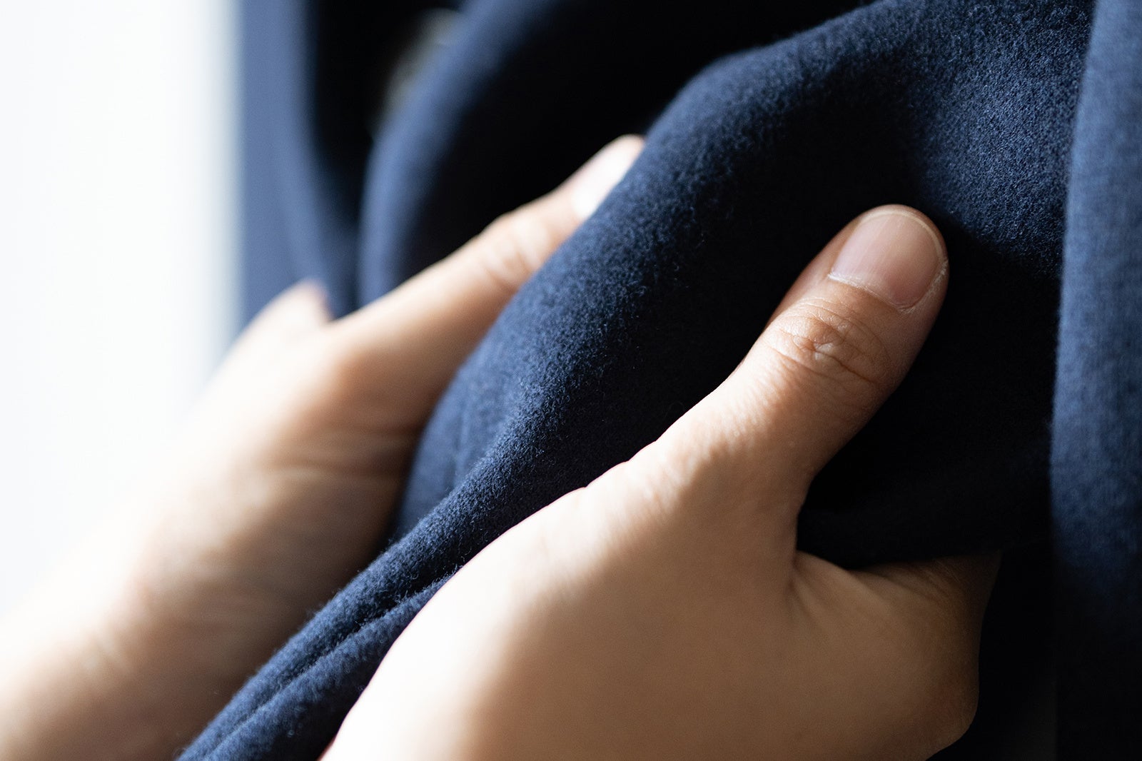 今回のカリアッジ×MOVBのコラボコートに採用した生地には、「フランネル」と呼ばれるカシミヤ20%の糸を使用し、MOVB特有の高密度ウールジャージーに編み立てました。
