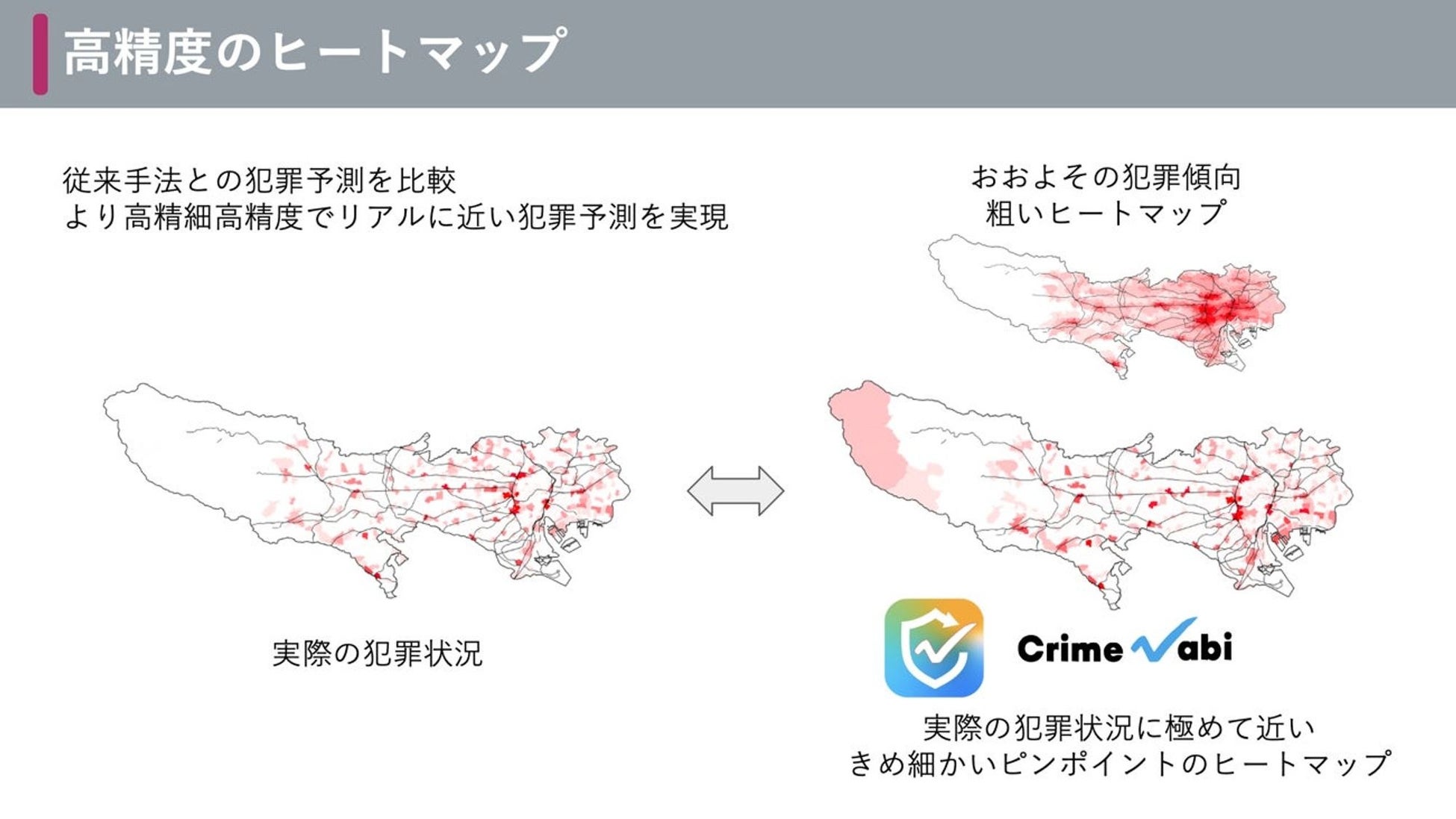左側が実際の犯罪発生パターンの時に、従来手法を用いると右上のような形でしか予測ができないところ、CRIME NABIを用いると右下のように高精度・高解像度な予測が可能です。このように実際の犯罪発生パターンとよく合致する予測を提供することができます。